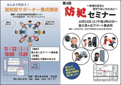 祭のお知らせ ・富士見ヶ丘駅地下通路の展示予定 ・歳末防犯パトロールの実施と隊員募集 ・集団古紙回収スケジュール ・特殊詐欺について高井戸警察から連絡 (サムネールをクリックすると拡大します) |